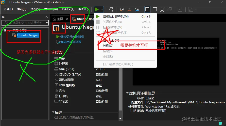 VmWare虚拟机中的虚拟机设置中《使用IOS映像文件》选项是灰色的,无法勾选,该怎么解决? Alicode 2023-04-13 202 阅读1分钟 无法勾选《使用IOS映像文件》选项??? 这种情况是因为没完全关机虚拟机系统导致的,关机一下虚拟机就可以了; 若嫌麻烦VmWare配置Ubuntu系统时不设置IOS映像文件,会怎么样? 会显示如下画面不能正常打开Ubuntu系统..... 此时我们应该先下载Ubuntu的ISO映像文件, 然后再重新启动Ubuntu就不会发生上述情况了。就可以正常安装上了......
