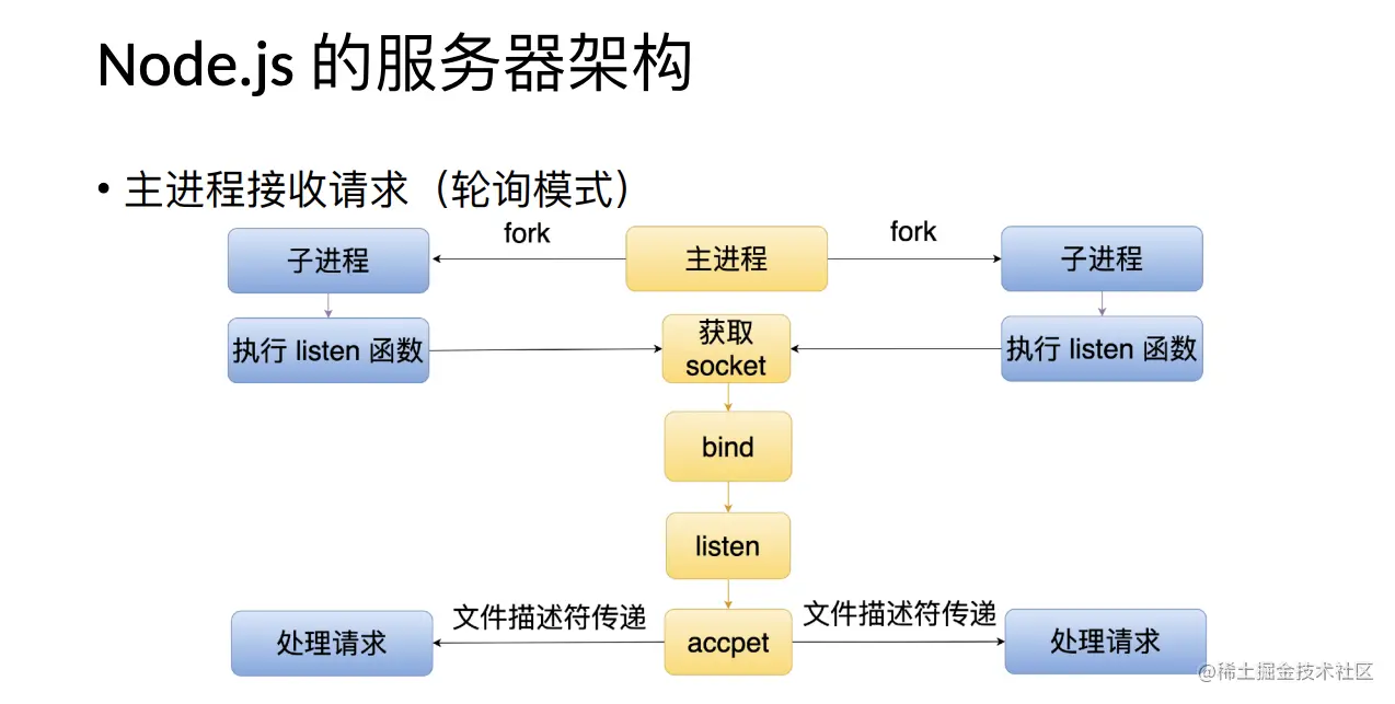 在轮询模式下,Node.js 的主进程通过 fork 的方式创建多个子进程。在每个子进程中,它会调用 listen() 函数,但是这个 listen() 函数并不会监听一个端口,而是会请求主进程去监听这个端口。一旦主进程确认监听了这个端口,并且接收到一个连接后,它会通过一种叫做文件描述符传递的技术,将连接传递到子进程进行处理。