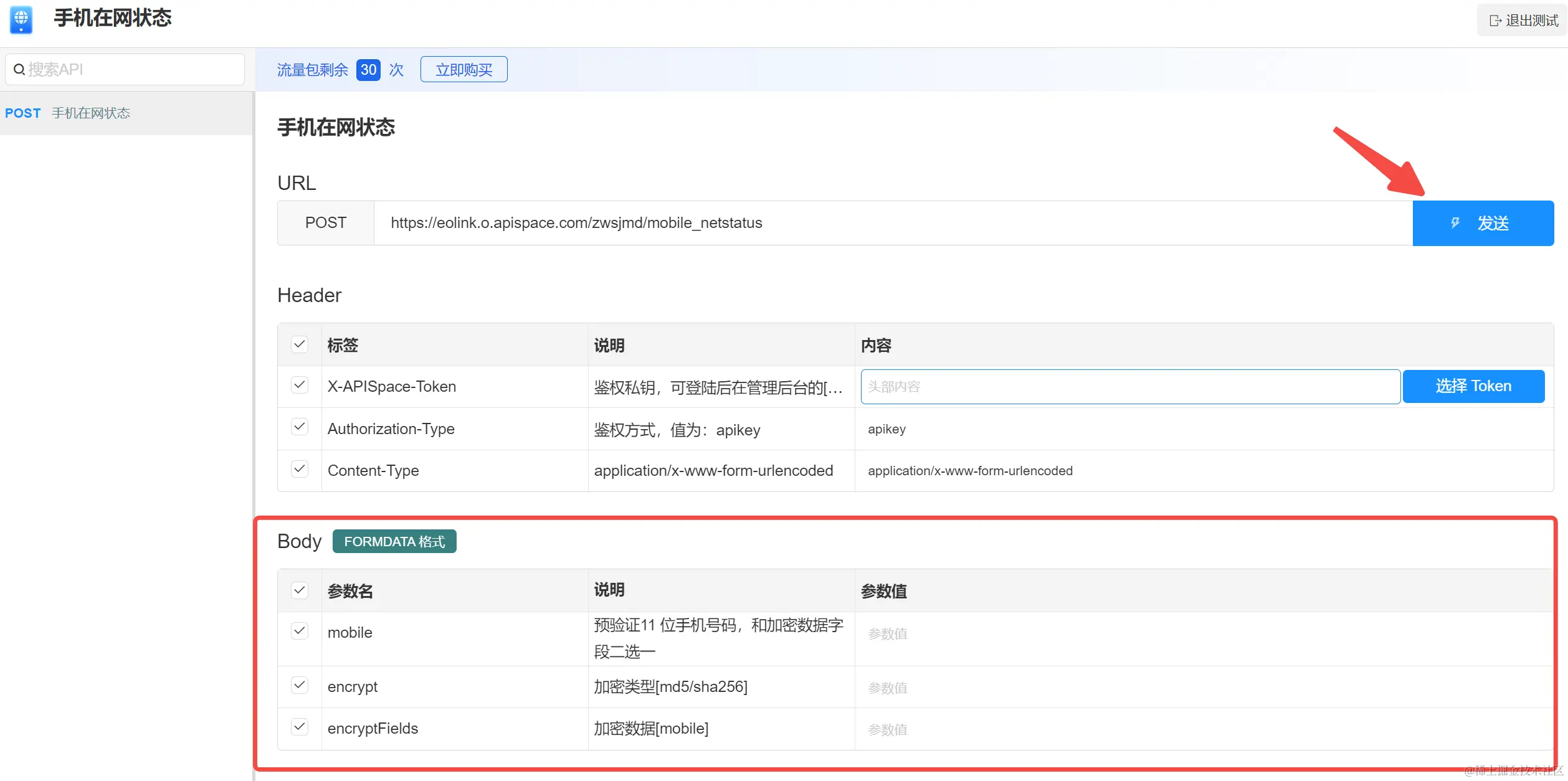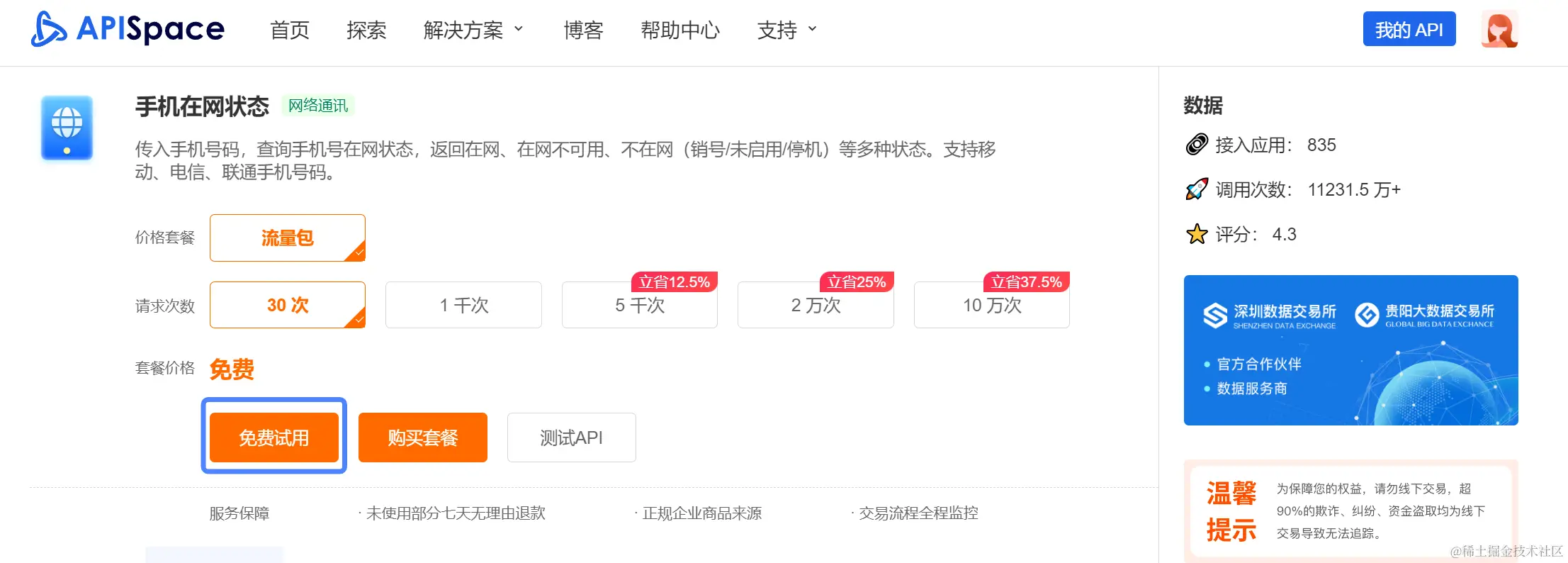 注册登录 APISpace 之后,在 手机在网状态 API 详情页 可以看到【免费试用】的按钮,点击即可获得相应的免费次数。