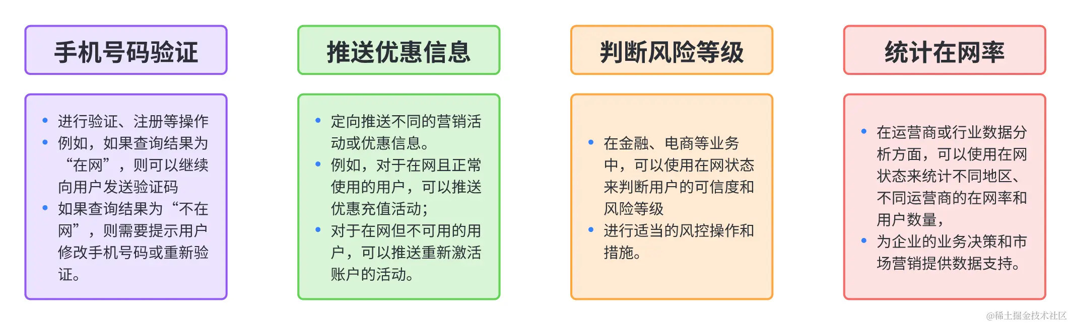 手机在网状态 API 支持传入手机号码,查询手机号在网状态,返回在网、在网不可用、不在网(销号/未启用/停机)等多种状态,查询手机号在网状态之后,可以根据具体的业务需求来进行不同的处理。