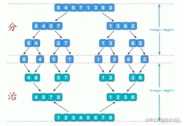 归并排序思想示意图2-合并相邻有序子序列: 再来看看治阶段,我们需要将两个己经有序的子序列合并成一个有序序列,比如上图中的最后一次合并,要将[4,5,7,8]和[1,2,3,6]两个已经有序的子序列,合并为最终序列[1,2,3,4,5,6,7,8],来看下实现步骤