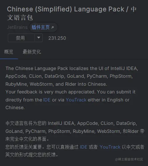 JetBrains官方开发的中文版本包,几乎支持JetBrains全家桶,用起来还行,目前大部分的菜单栏都能翻译了。 不过看惯了英文版,切换之后看一些翻译总是觉得怪怪的。。。而且虽然显示是中文,但是有时候在settings中搜索中文却得不到想要的结果。。。