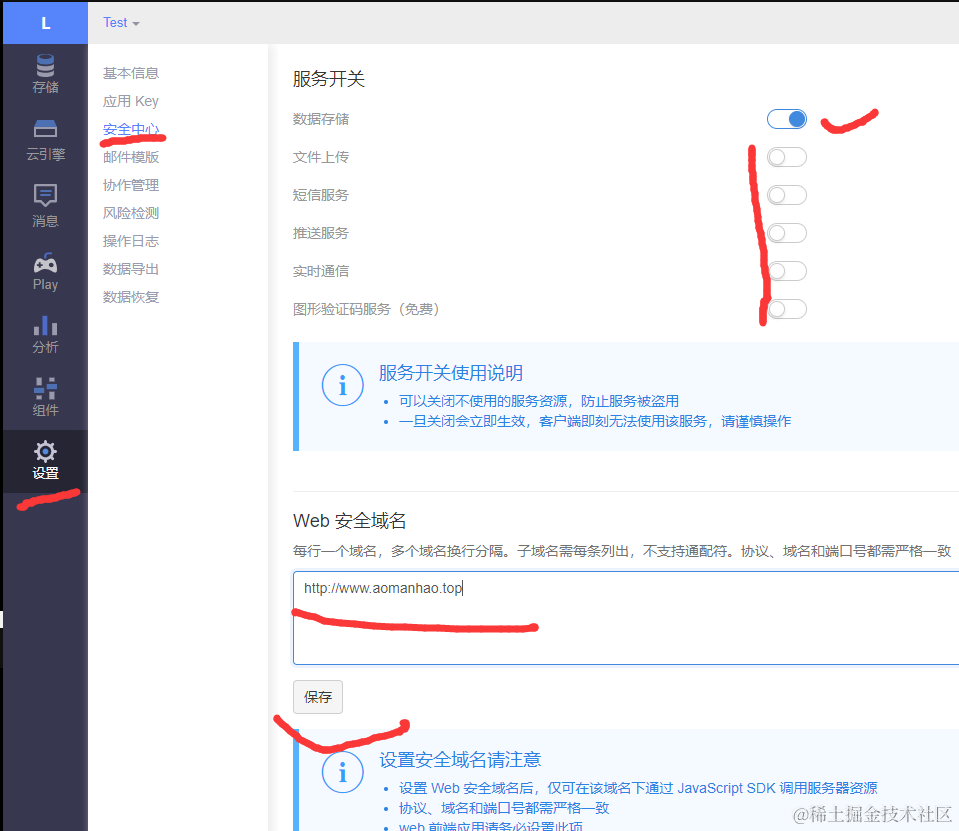 点击设置 > 安全中心 把自己博客网址添加到安全中心,保证数据的调用安全。