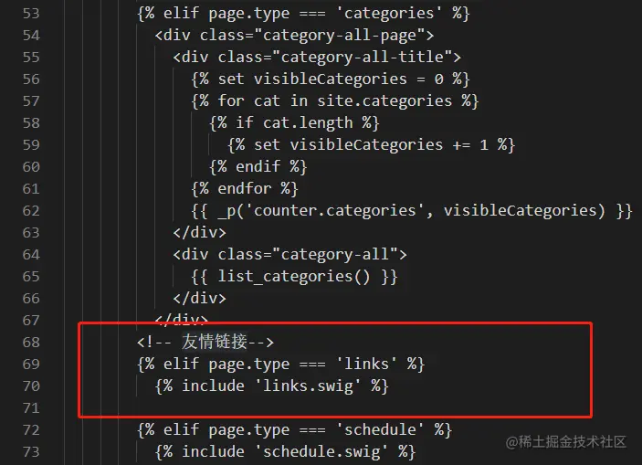 然后还是在这个 page.swig 文件中,引入刚才新建的 swig 页面: