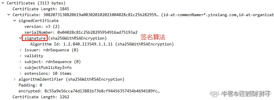 - 获取证书,得到证书内容、证书签名算法和数字签名。