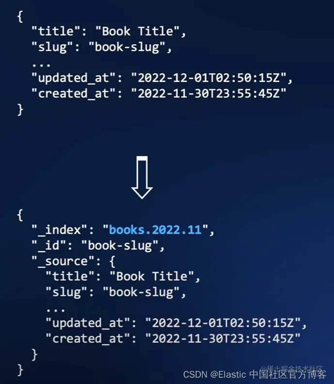 比如在上面,我们可以看到一个字段叫做 created_at。它是发生在 2022-11-30 这个天。我们想把这个文档写入到我们想要的索引名称中 books.2022.11。道理很简单,我们就是想把当月的所有文档归于同样的一个索引名称 books.2022.11 这个索引中。以后便于归档及搜索。在实际的生产环境中,有这种需求。那么我们该如何实现我们的这种需求呢?