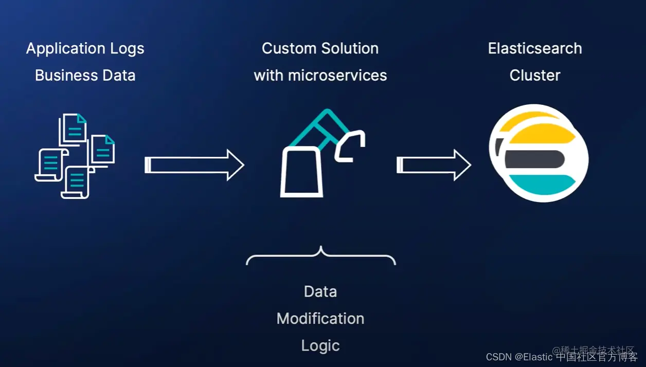 在上面,我们使用定制的微服务来摄入商业应用文档,并使用我们的算法来修改文档,最终通过 client 库把文档写入到 Elasticsearch 中。这种方法的缺点是你需要编写相应的应用程序来完成。针对大量的数据,我们可能没有缓冲,有时我们甚至不能保证至少一次传输。这种在 Logstash 和 Filebeat 中都有实现。