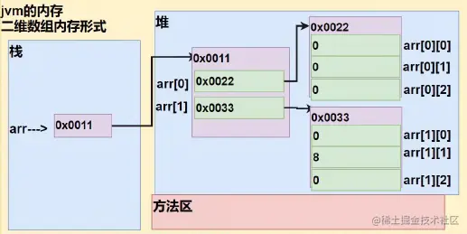 定义类型数组名[][] = {{值1,值2..},{值1,值2..},{值1,值2..}} int[][] arr = {{1,1,1}, {8,8,9}, {100}};