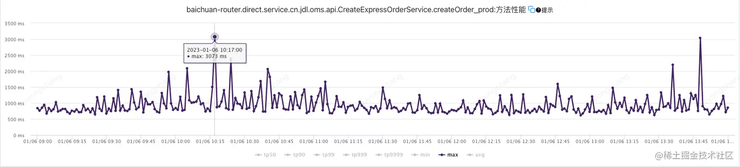 查看此服务UMP打点,发现此服务的方法性能监控MAX值最大3073ms,未超过调用方设置的超时时间10000ms(如图1所示)