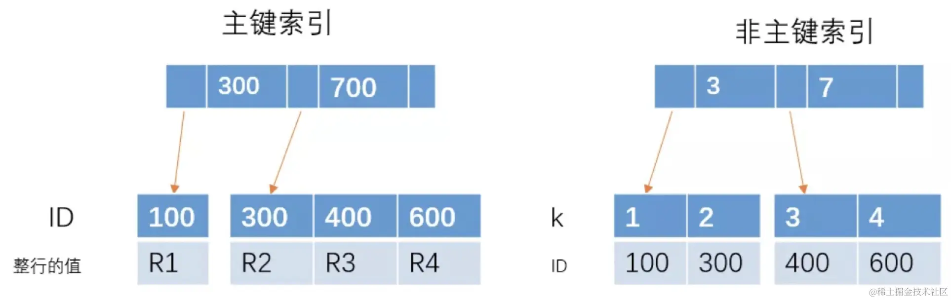 从图中不难看出,主键索引和非主键索引的区别是:非主键索引的叶子节点存放的是主键的值,而主键索引的叶子节点存放的是整行数据,其中非主键索引也被称为二级索引,而主键索引也被称为聚簇索引。