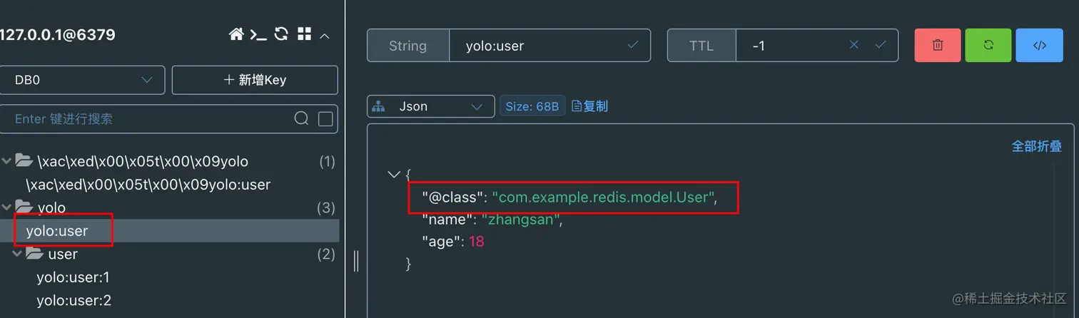 整体可读性有了很大提升,并且能将Java对象自动的序列化为JSON字符串,并且查询时能自动把JSON反序列化为Java对象。不过,其中记录了序列化时对应的class名称,目的是为了查询时实现自动反序列化。这会带来额外的内存开销