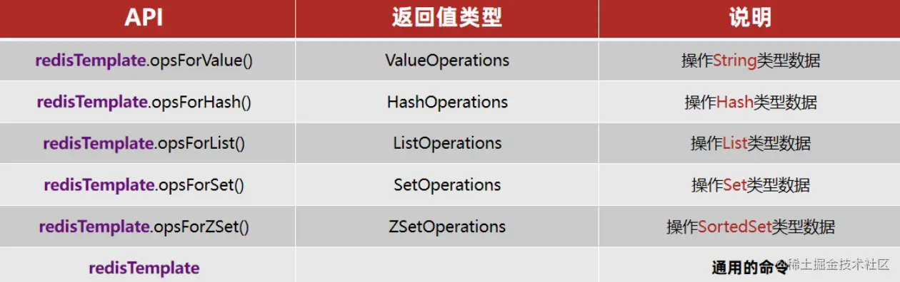 SpringDataRedis中提供了RedisTemplate工具类,其中封装了各种对Redis的操作。并且将不同数据类型的操作API封装到了不同的类型中