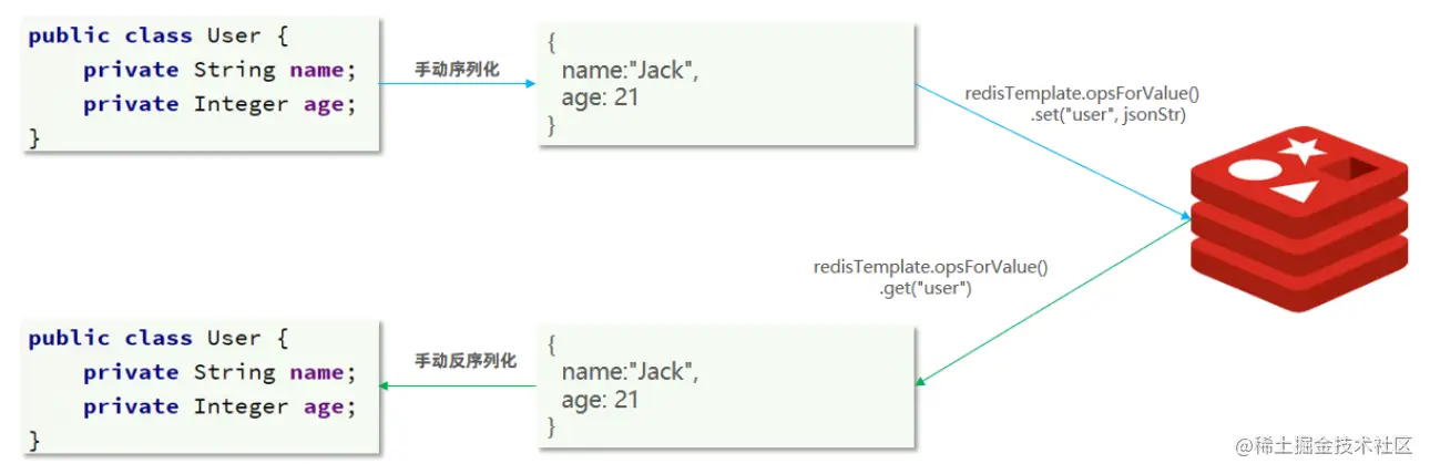 如果Value是一个Java对象,例如一个User对象,则可以将对象序列化为JSON字符串后存储: