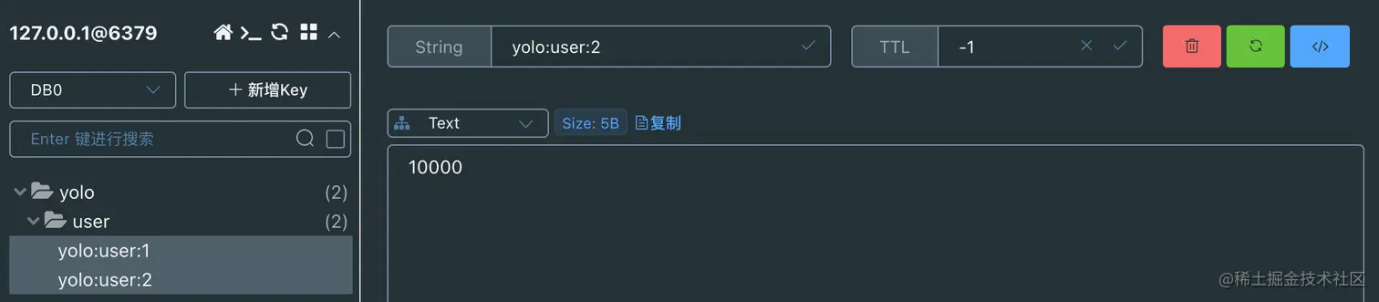 KEY VALUE yolo:user:1 {"id":1, "name": "Jack", "age": 21} yolo:product:1 {"id":1, "name": "小米11", "price": 4999} 一旦我们向redis采用这样的方式存储,那么在可视化界面中,redis会以层级结构来进行存储,形成类似于这样的结构,更加方便Redis获取数据