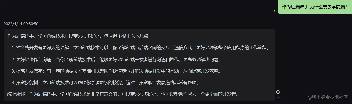 总之一句话 学习前端 可以让我们对全栈开发有着更加深入的理解,当然我们更应该将关注点放在前后端之间的交互上,通信方式上,这样才可以便于理解整个应用程序的工作流程。