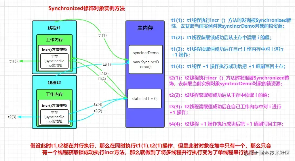 如果t2线程在t1线程读取旧值和写回新值期间(也就是t2在t1在自己工作内存中做+1计算时)读取全局资源i的值,那么t2线程就会与t1线程一起看到同一个值,并执行相同值的+1操作,这也就造成了线程安全失败,因此对于incr方法必须使用synchronized修饰,做到线程的互斥解决线程安全问题。