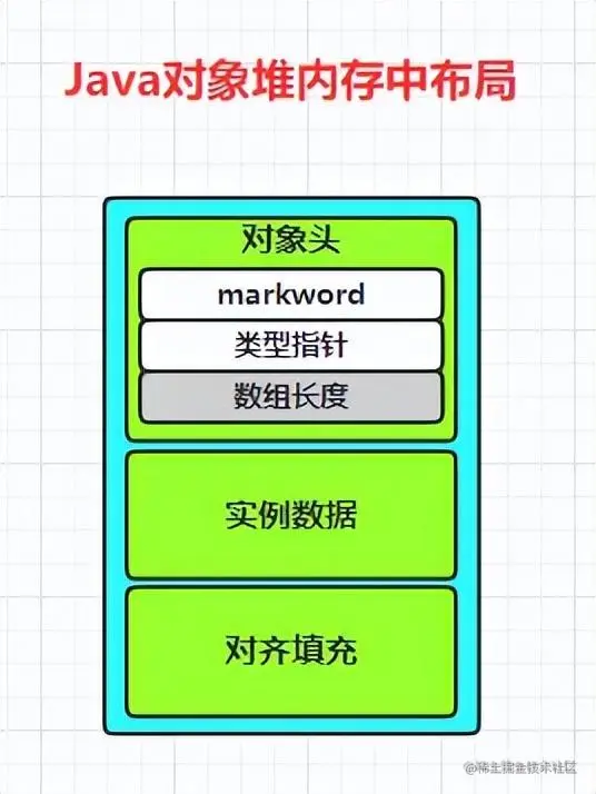 - 对象头: 存储MarkWord和类型指针(ClassMetadataAddress/KlassWord),如果是数组对象,还会存在数组长度。