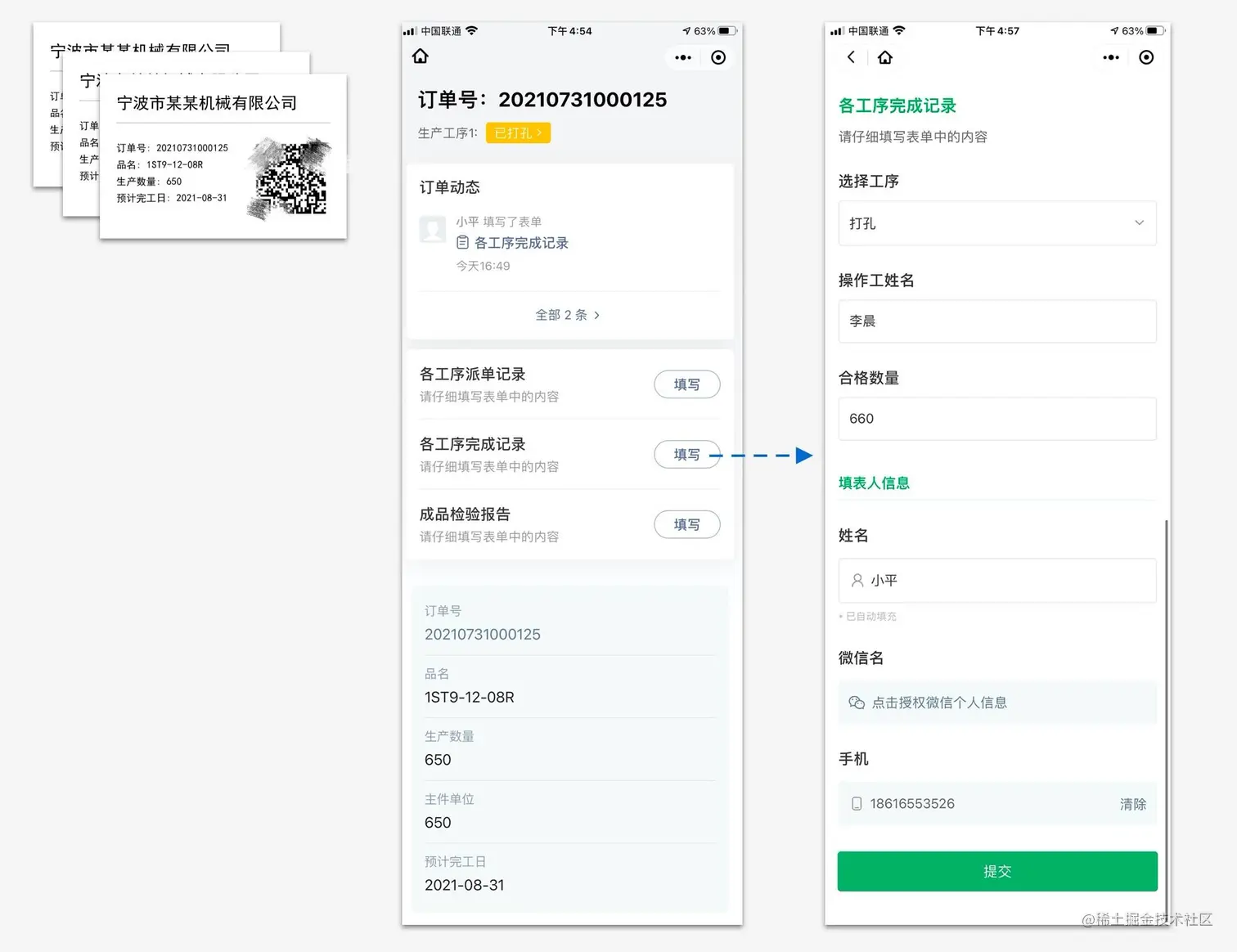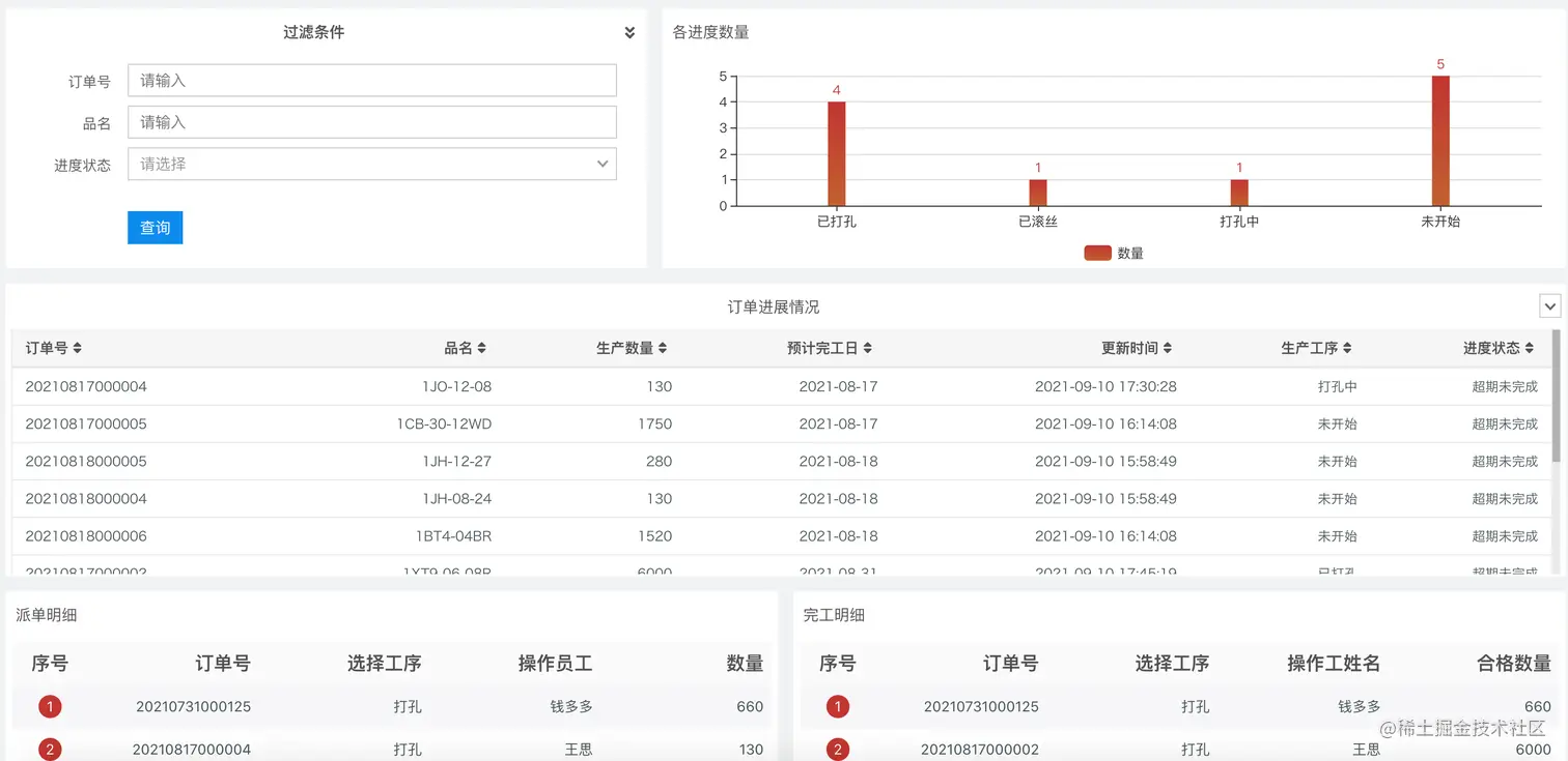 每个订单生成一个二维码,如果销售订单有多个产品,需要先拆分成多个子订单生码。记录各个工序的派单记录和工序结束工时记录。还会显示最新的进度状态。