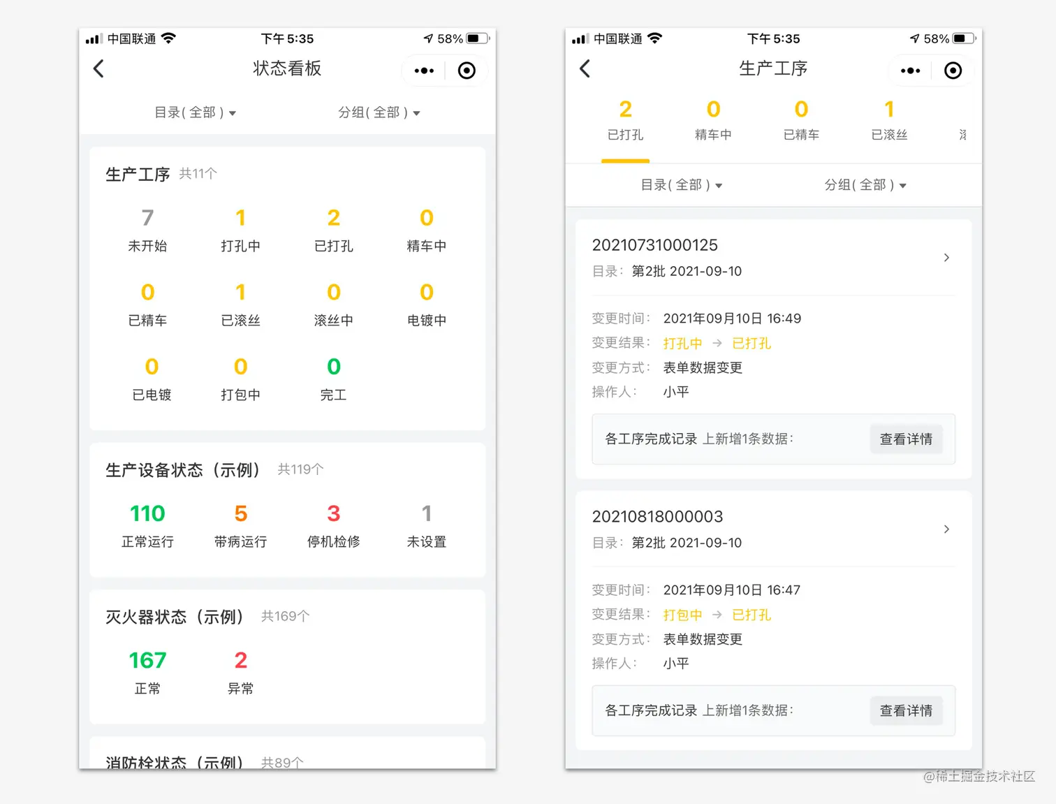 添加工序记录时,设置好触发状态。就可以通过小程序工作台的状态看板,查看整体的工序完成情况。