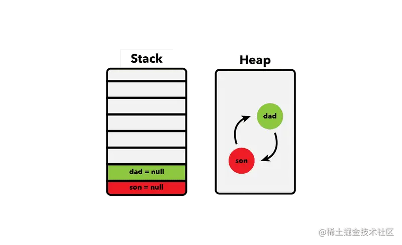 因为对象相互引用,算法不会释放分配的内存。我们无法再访问这两个对象。因为它们都有传入引用,计数算法就没法使引用识别出它们不能再使用。