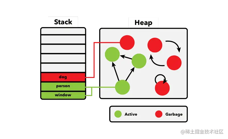 mark-and-sweep算法有解决循环依赖的方法。它不是简单地计算对给定对象的引用,而是检测它们是否是从根对象可达,浏览器中的根是Object,而在 NodeJS 中是windowglobal。