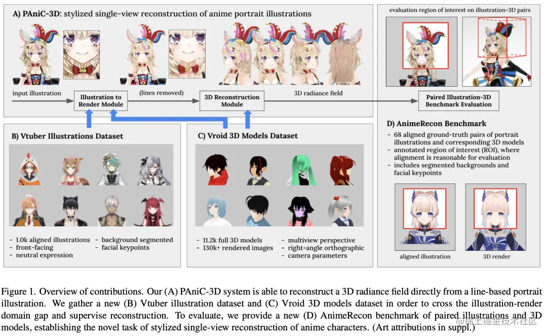 传统的 3D 人像重建工作通常只适用于真人的图片,而在动漫角色的 3D 重建方向的探索较少。在这篇文章中,研究者们探索了第一个基于 3D GAN 的 2D-3D 动漫角色重建模型。作者们贡献了两个卡通角色训练集(1) Vtuber Illustrations Dataset和(2) Vroid 3D Models Dataset。