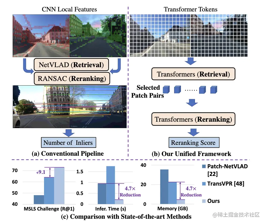 视觉位置识别(VPR)通过将查询图像与参考数据库中的图像进行匹配来估计查询图像的位置。传统方法一般采用聚合 CNN 特征进行全局检索,并采用基于 RANSAC 的几何验证进行重新排序。然而,RANSAC 只考虑几何信息,但忽略了其他可能对重新排序有用的信息,例如局部特征相关性和注意力值。