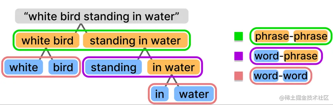 首先作者分析了这个任务中现有文字表达主要的三种组合方式,即单词与单词的组合,单词与词组的组合,词组与词组的组合,可见下图中的例子。