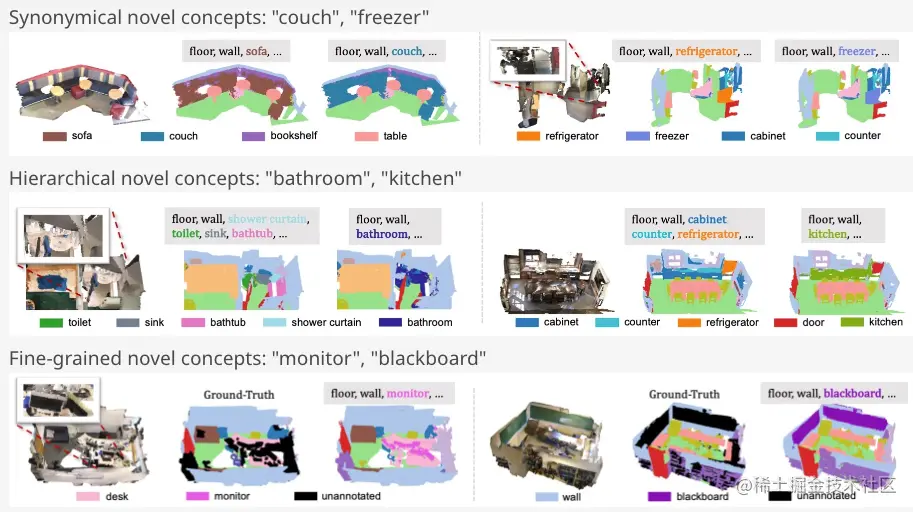 开放词汇三维场景理解旨在识别未标注的新颖类别。目前 2D 开放词汇检测已经有成功的方法,但是他们都依赖爬取互联网上海量成对的图片和文字进行训练,或者利用已有的 2D 大模型。然而成对的 3D 数据和自然语言并不能直接从互联网上免费获取,需要昂贵的人工标注,从而也难以训练大模型。