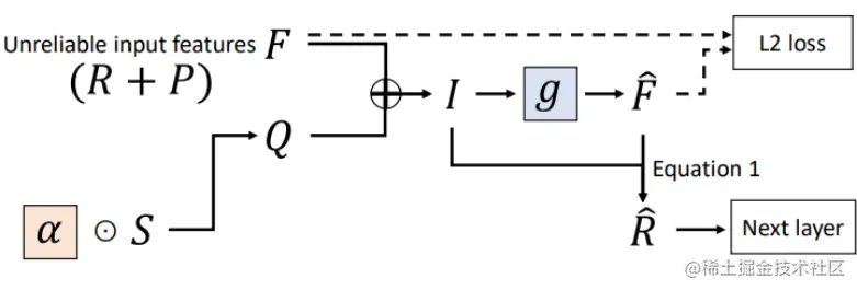 在本文中,作者为自注意力网络提出了 Token 强化模块 TBM(Token Boosting Module)。该模块由一个小型的自编码器网络 g 以及可学习参数 α 构成,可以将之放置在任意自注意力网络模块后。该自编码器网络的输入特征由两部分 F、Q 构成。F 表示前级网络输出的含噪特征,Q 表示可控噪声(由 α 调节),两者相加构成输入特征。输入特征 I 送入自编码器网络 g 进行重构,得到的重构特征 F^ 经由公式(1)的计算得到模块输出 R^ 并送入自注意力网络的下一层。作者在文中进行了相应的理论推导得出结论,经过 TBM 的处理,模块的输出特征在保留表征能力的基础上具备了对噪声输入的鲁棒性,并进行了详尽的实验验证。