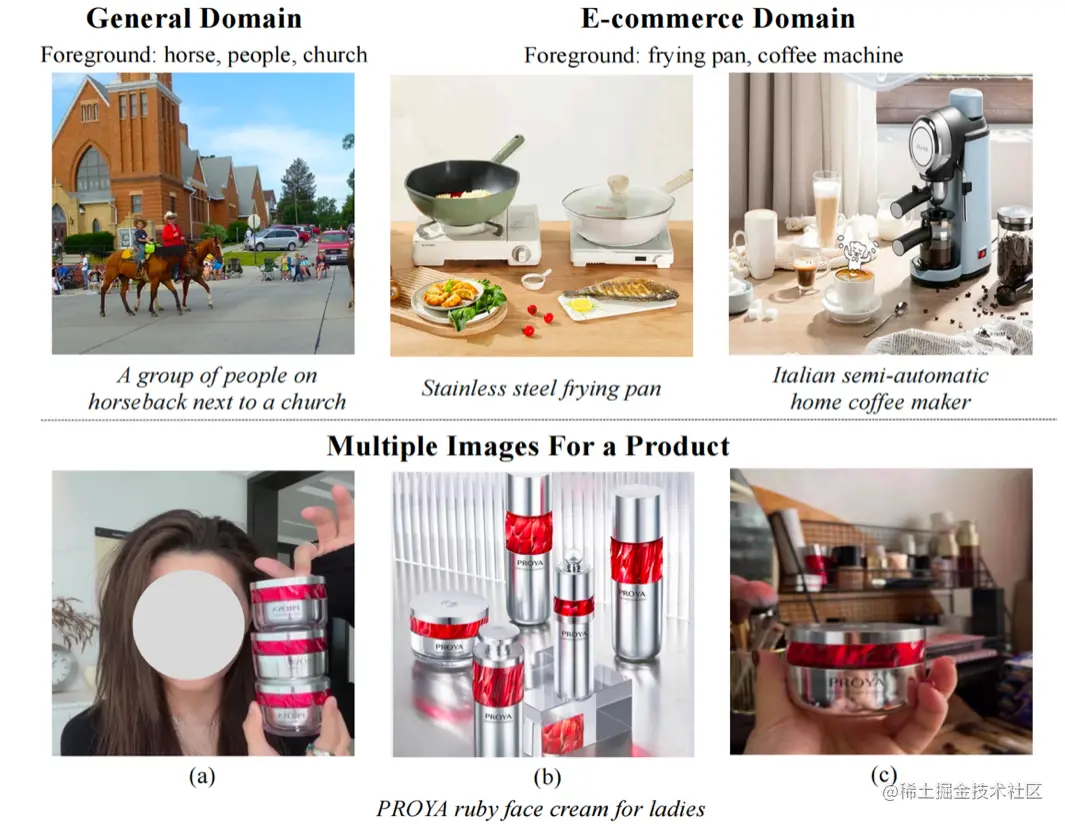 目前在自然图像中的视觉语言学习中,已经出现类似 CLIP 这样的基础模型。其基于大规模的图像-文本对来学习一个通用多模态表示,从而在不同的视觉语言任务中取得了显著的进步。但是,我们却不能直接在电子商务领域中使用这些模型。下图显示了自然图像和电商领域的商品图片的不同特性: