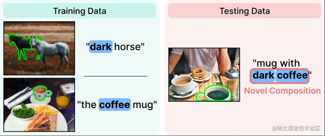 如下图中的例子所示,模型在在训练集中见过 dark 和 coffee 这两个单词,但没见过 dark coffee 这个组合。当模型在测试时遇到这个组合,出现无法理解的情况,从而预测失败。