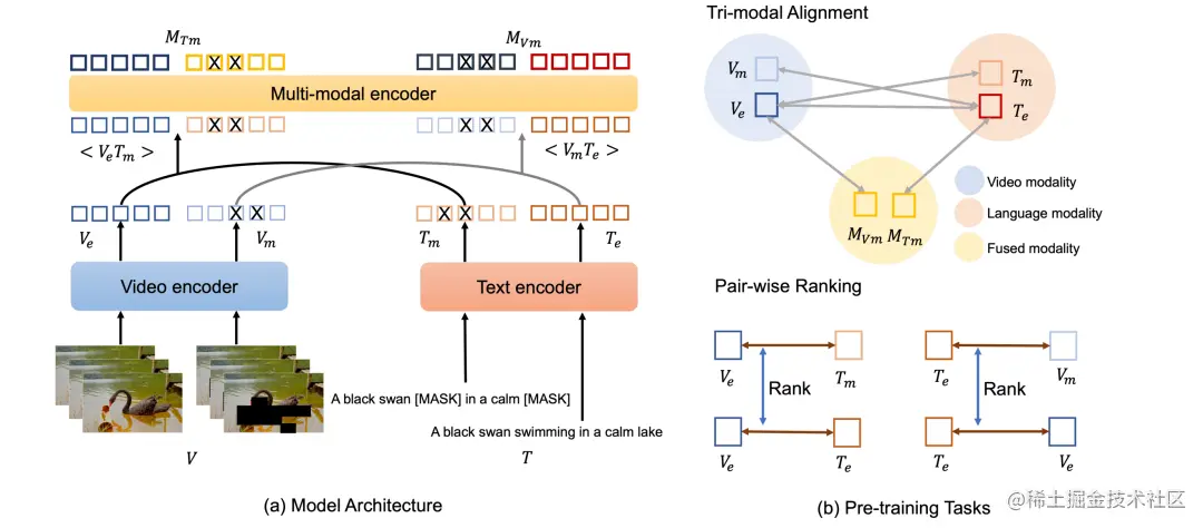 因此,作者团队提出了 Clover 视频文本预训练方案来进行优化。沿用单模态特征编码器+跨模态特征编码模块的框架,本文在 Clover 中引入了一种三模态对齐的预训练任务,即将视频模态,文本模态以及视频文本融合模态在特征空间进行对齐。作者借助对训练样本的语义 masking 策略来增强三模态对齐训练的效果,同时引入了 pair-wise ranking loss 来辅助更精细的 pair-wise 特征对齐。此外,Masking Language Modeling 的训练思想被用于对跨模态特征融合模块的训练。