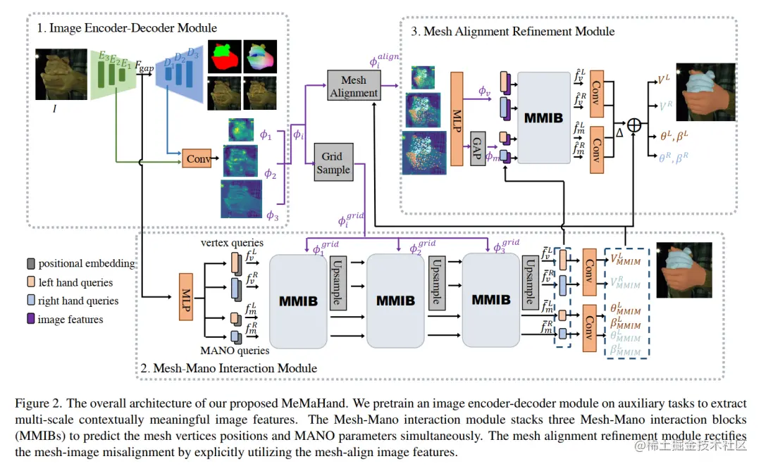 MMIB 由一个用于聚合局部信息的图卷积残差块和两个具有远程依赖关系建模能力的 Transformer 编码器组成。Transformer 编码器配备了不同的非对称注意力掩码,分别对两只手内部和它们之间进行注意力建模。此外,我们引入了网格对齐修正模块以进一步增强手部网格与图像之间的对齐。