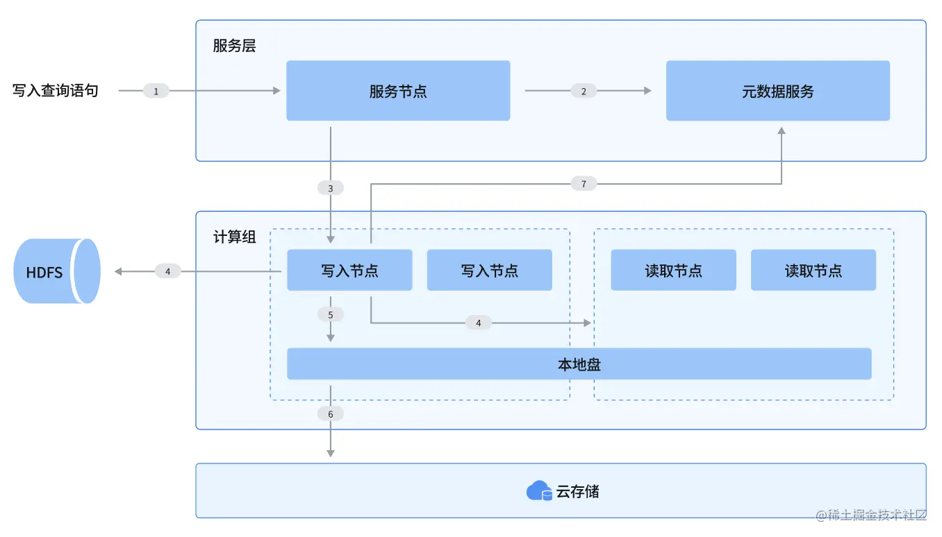 - Query 从远程文件系统获取原始数据,并根据 Query 的执行计划在计算节点上执行,并发回计算结果给服务节点汇总。