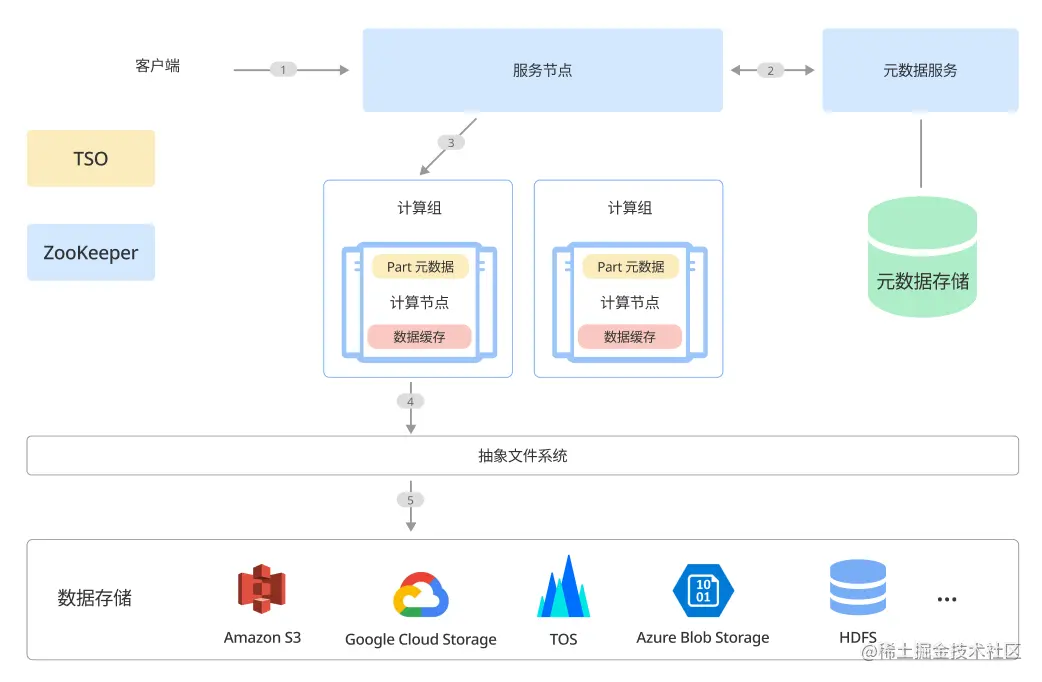 采用 HDFS 或 S3 等云存储服务作为数据存储层,用来存储实际数据、索引等内容。