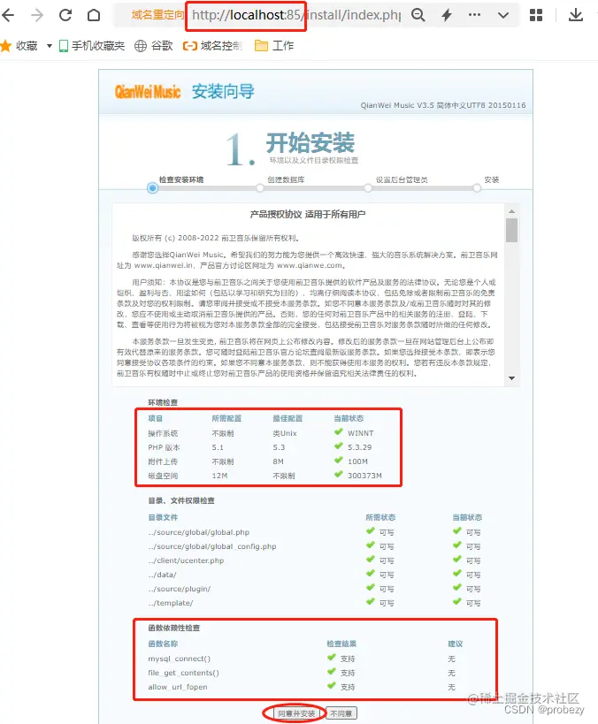 这时我们在浏览器地址栏中输入对应的端口号进行访问,就能进入QianWei音乐网站的安装界面。在开始安装前,网页会对几项关键项目进行自检,只有通过目录、文件权限和函数依赖性检查后,才能进行下一步安装。