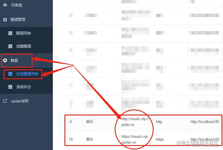 隧道创建成功后,可以在“状态”项下的“在线隧道列表”中找到本地音乐网站的公共互联网地址,将这个公共互联网地址输入浏览器,就能成功访问到位于本地电脑上的音乐网站。