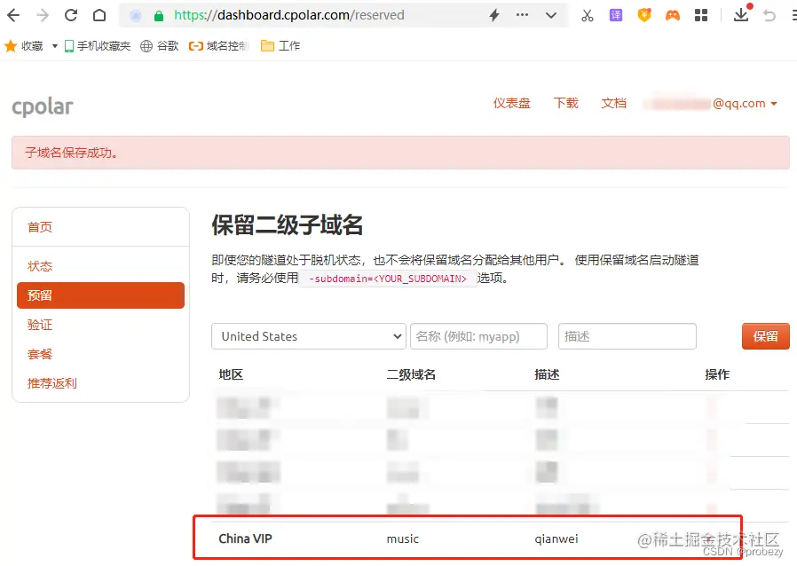 在各项信息填写完毕后,就可以点击右侧的“保留”按钮,生成一条固定的二级子域名隧道。