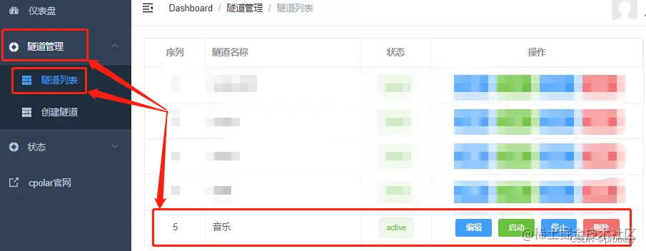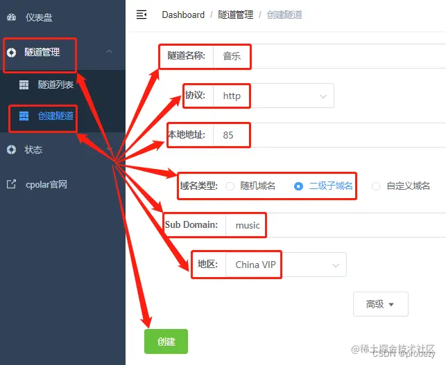 进入cpolar本地端后,我们点选“隧道管理”项下的“创建隧道”选项,进入“创建隧道页面”,将cpolar云端建立的空白数据隧道与本地音乐网站关联起来,而关联的设置,就在这个页面通过信息填写进行,这些信息包括: