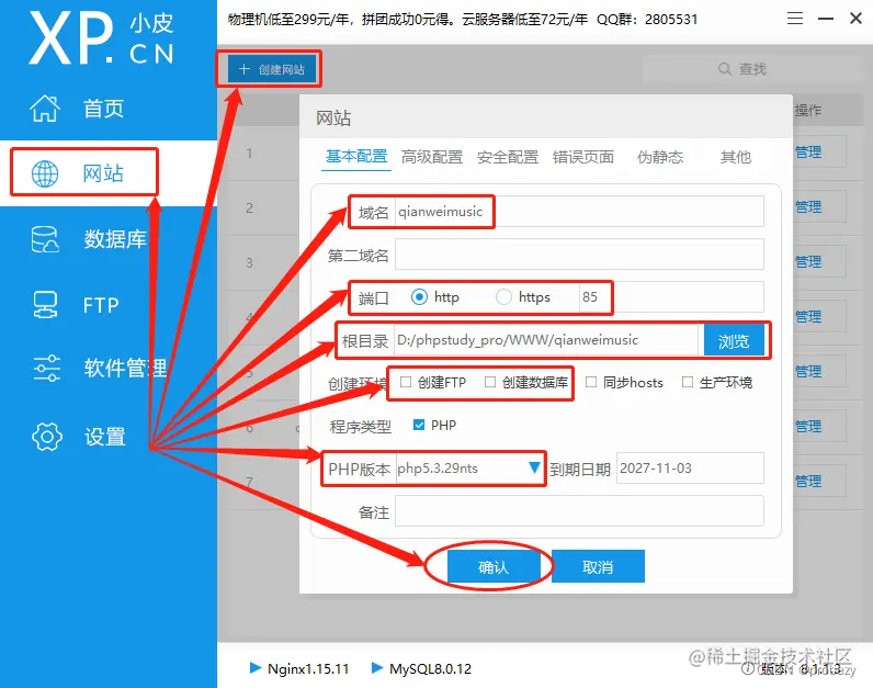 接着,我们回到PHPstudy的“网站”页面,点选左上角的“创建网站”按钮,设置QianWei音乐网站所需的运行环境。设置的内容包括