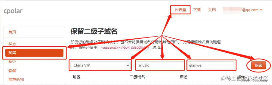 登录cpolar官网后,我们在“仪表盘”页面左侧找到“预留”项,并在“预留”页面选择“保留二级子域名”栏位。在“保留二级子域名”栏位,我们需要对该隧道进行几项简单的信息设置。