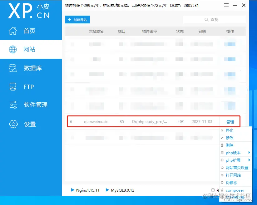 完成这几项设置后,就可以点击页面下方的“确认”按钮,保存各项设置,PHPStudy会自动生成网页运行所需的环境。如果之后运行环境有什么变更,也可以通过网站条目右侧的“管理”按钮进行修改。