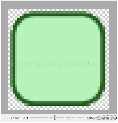 这是一张 PNG 图片,为了方便观看做的比较大。在 Android 中使用 NinePatch 图片的一般都是很小的图片,因为当内容多了的时候,背景会自动拉伸来适应内容,而如果图片做大了,内容少,则图片也不会自动变小,所以用作 NinePatch 图片的 png 图片一般是比较小的。