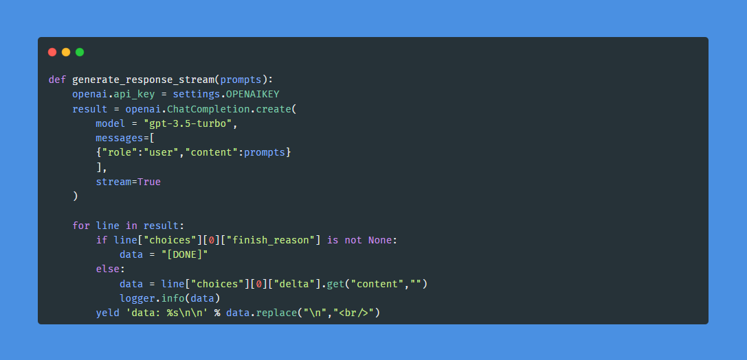 上述方法是定义了请求OpenAI接口获取返回结果,stream=True是开启流式回复。