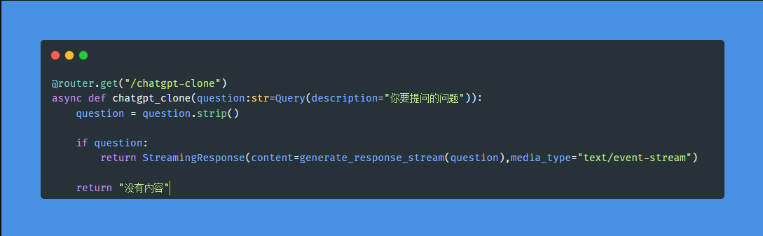 后端我们采用fastapi框架,通过调用OpenAI的接口返回请求的接口,而这次改用数据流的方式返回,关键代码如下: