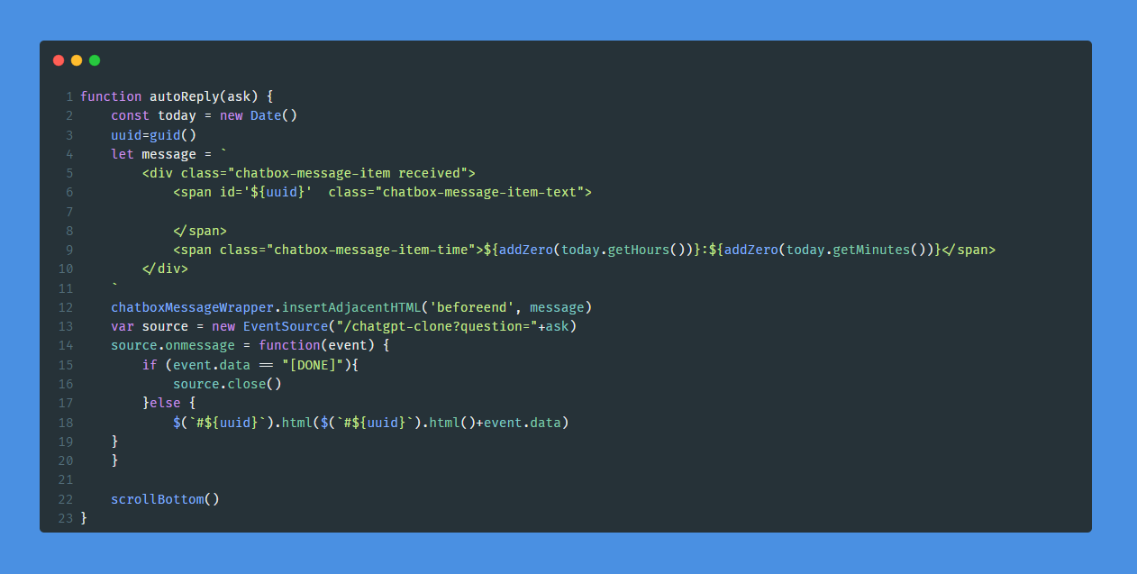 回到前端代码中autoReply方法进行修改即可。采用EventSource去请求接口,并把结果渲染。