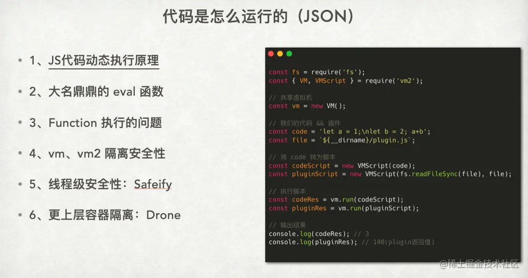 当然,需要额外提及的是官方的 vm 模块存在一些安全性问题。动态执行代码有很多方式,比如 function 等,但为什么在最佳实践中,这些方式基本上都没有被使用呢?最大的问题就是,vm 直接将一些敏感的运行环境数据暴露给了用户,用户可以在虚拟机内部进行修改,从而涉及到了较大的安全性问题。因此,社区现在基本上都在使用 vm2 来替代官方的 vm 模块,处理一些动态执行的场景。