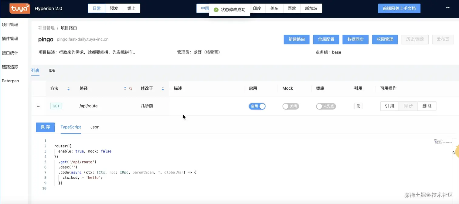 这些路由像你写代码的时候,Controller 层的一个一个的方法,它把这些方法写到运行时里面,运行时就是 BFF 网关,运行时会解析请求,然后根据配置进行代理。我们简单地新建一条路由,试一试这种配置方式。