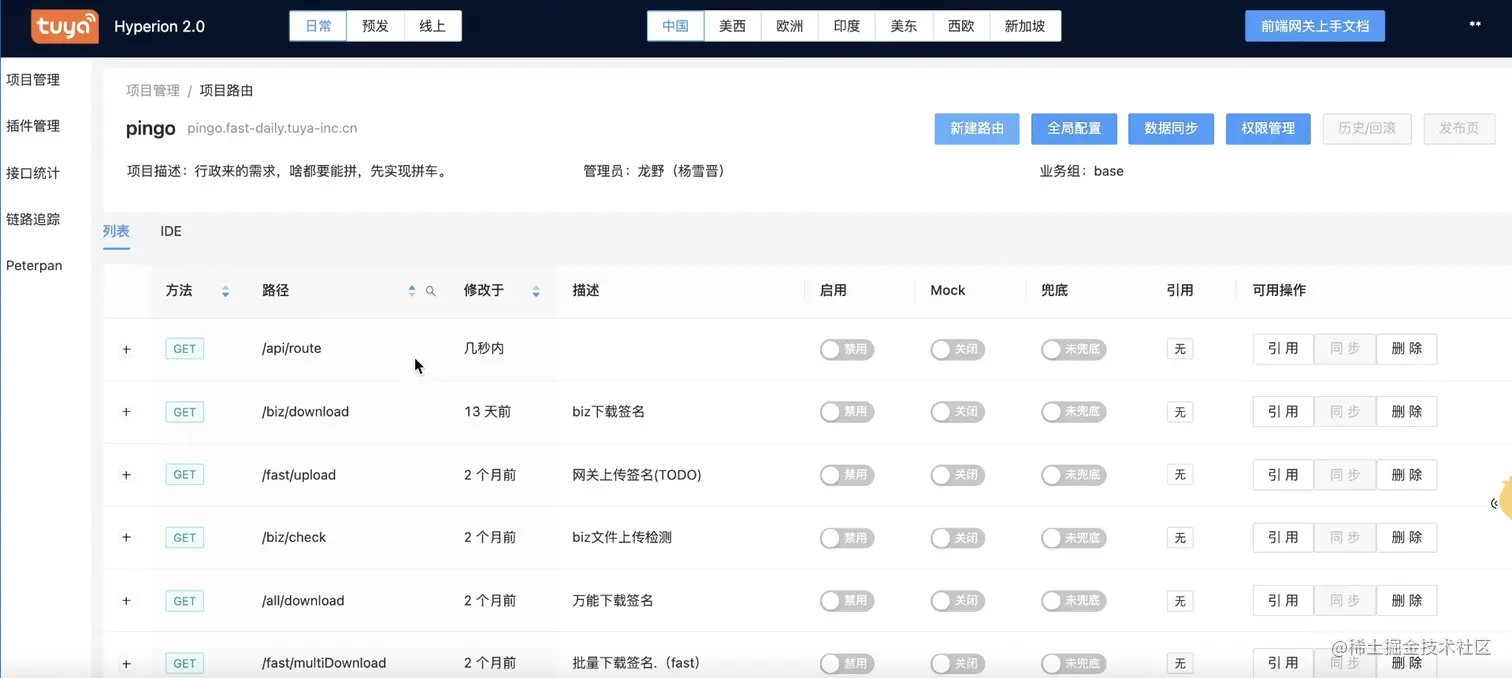 在我们公司的网关后台管理页面中,可以看到项目的域名配置。这个域名会被解析到 Nginx,然后再到网关。域名的解析方式可以使用泛解析,例如 *.xxx.com 的方式。默认情况下,请求会解析到 fast 网关,也就是我们的 BFF 网关。